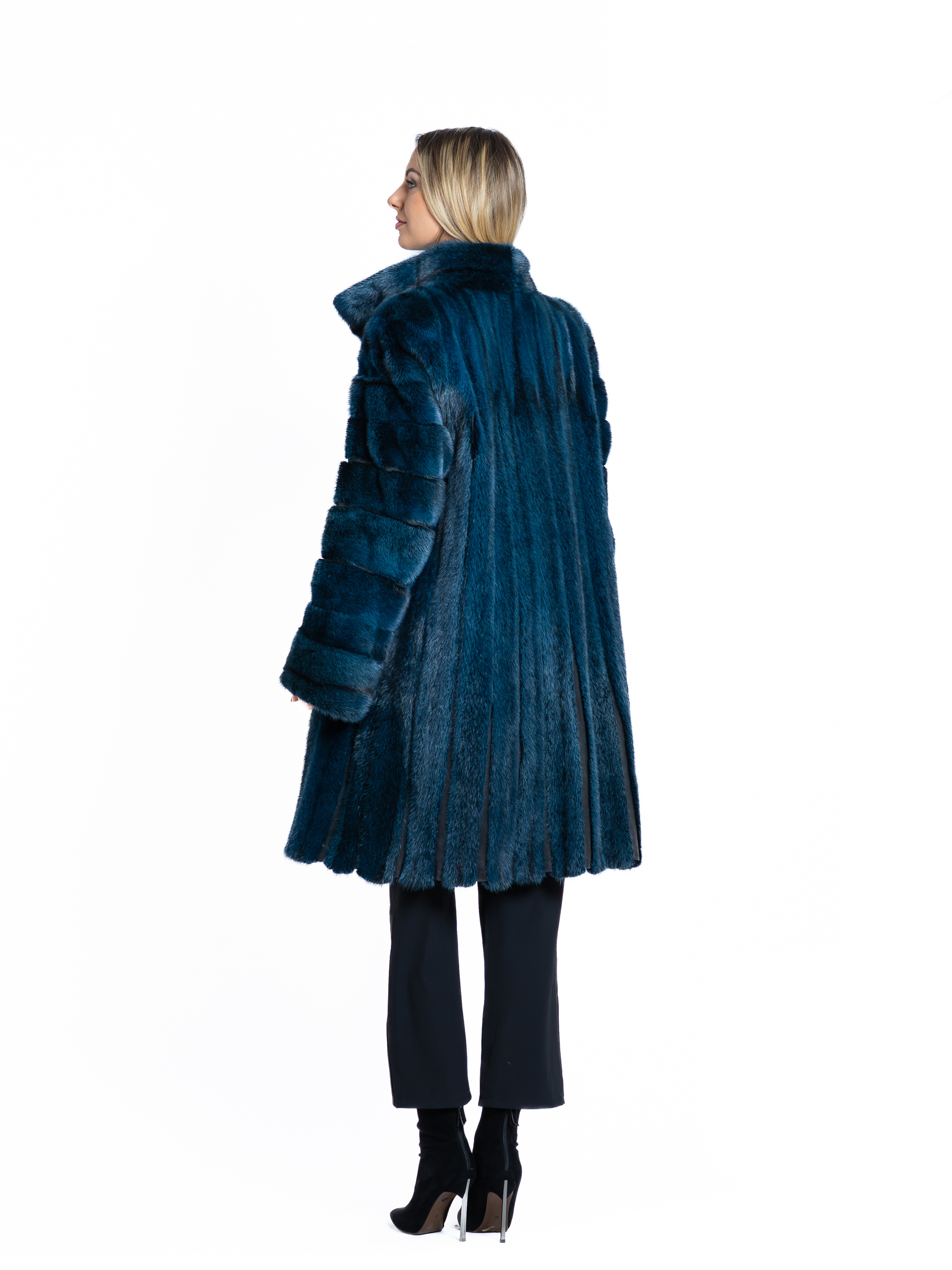 Paltonul din nurcă Graphite Blue se remarcă prin cromatica sa aparte, situată între albastru intens și tonuri grafit, oferind un efect vizual elegant și sofisticat.
