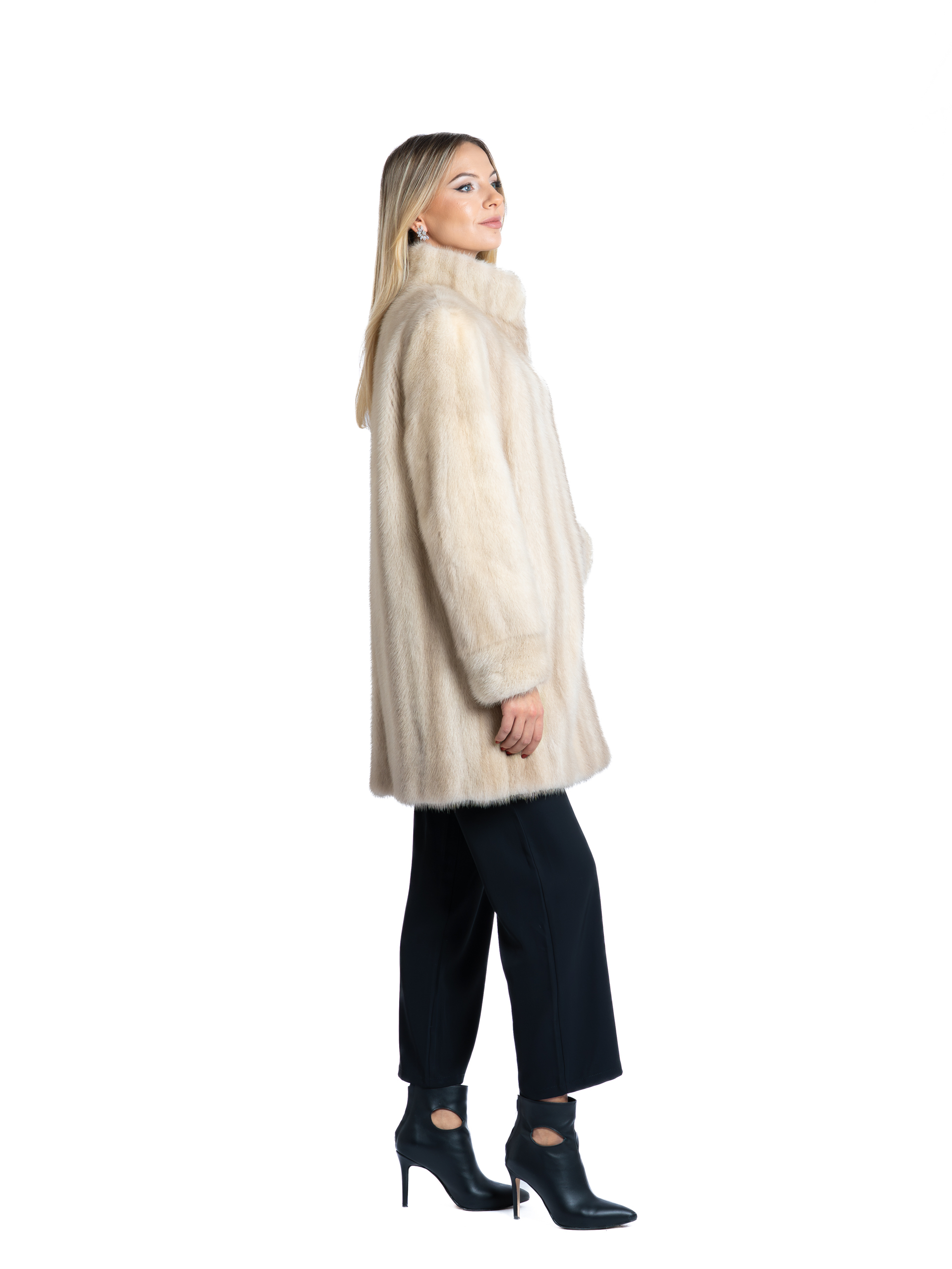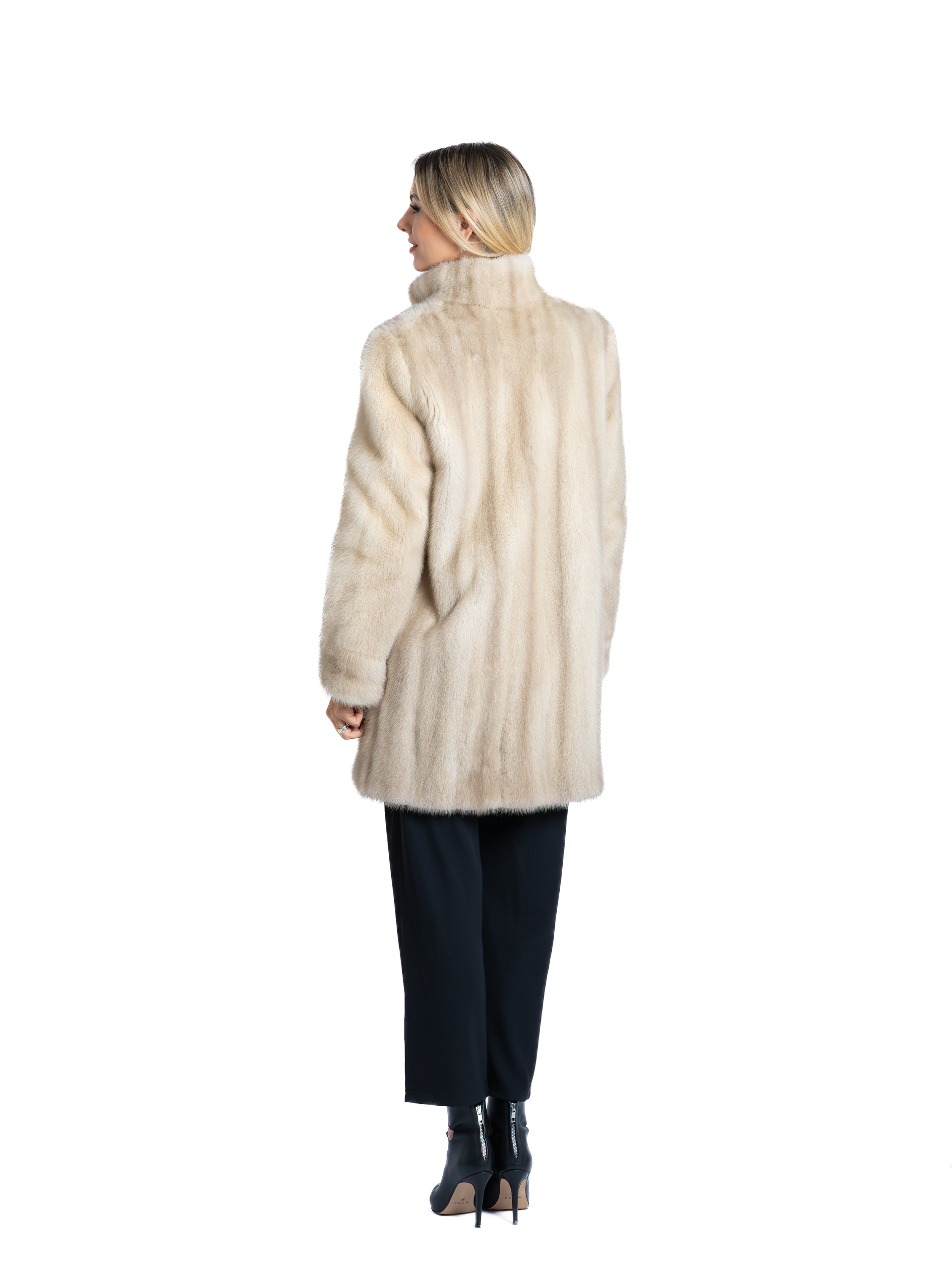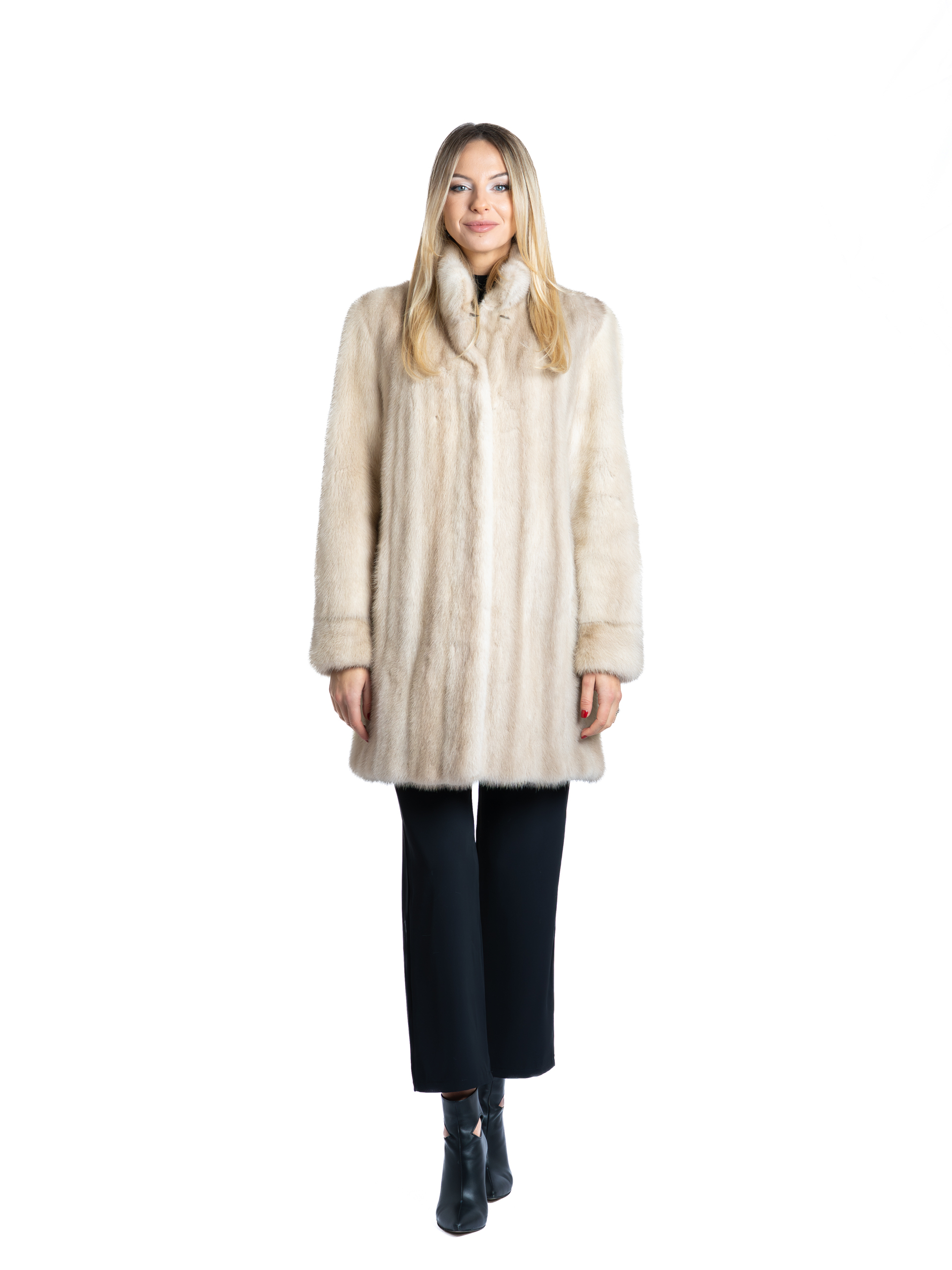Lungimea este optimă (aproximativ ¾), asigurând o purtare comodă și versatilă, ideală pentru zilele friguroase. Blana de nurcă, mătăsoasă și densă, este cusută cu precizie, asigurând un aspect fluid și un confort termic excepțional. Închiderea frontală este discretă, cu clipsuri ascunse, menținând neîntreruptă frumusețea blănii.