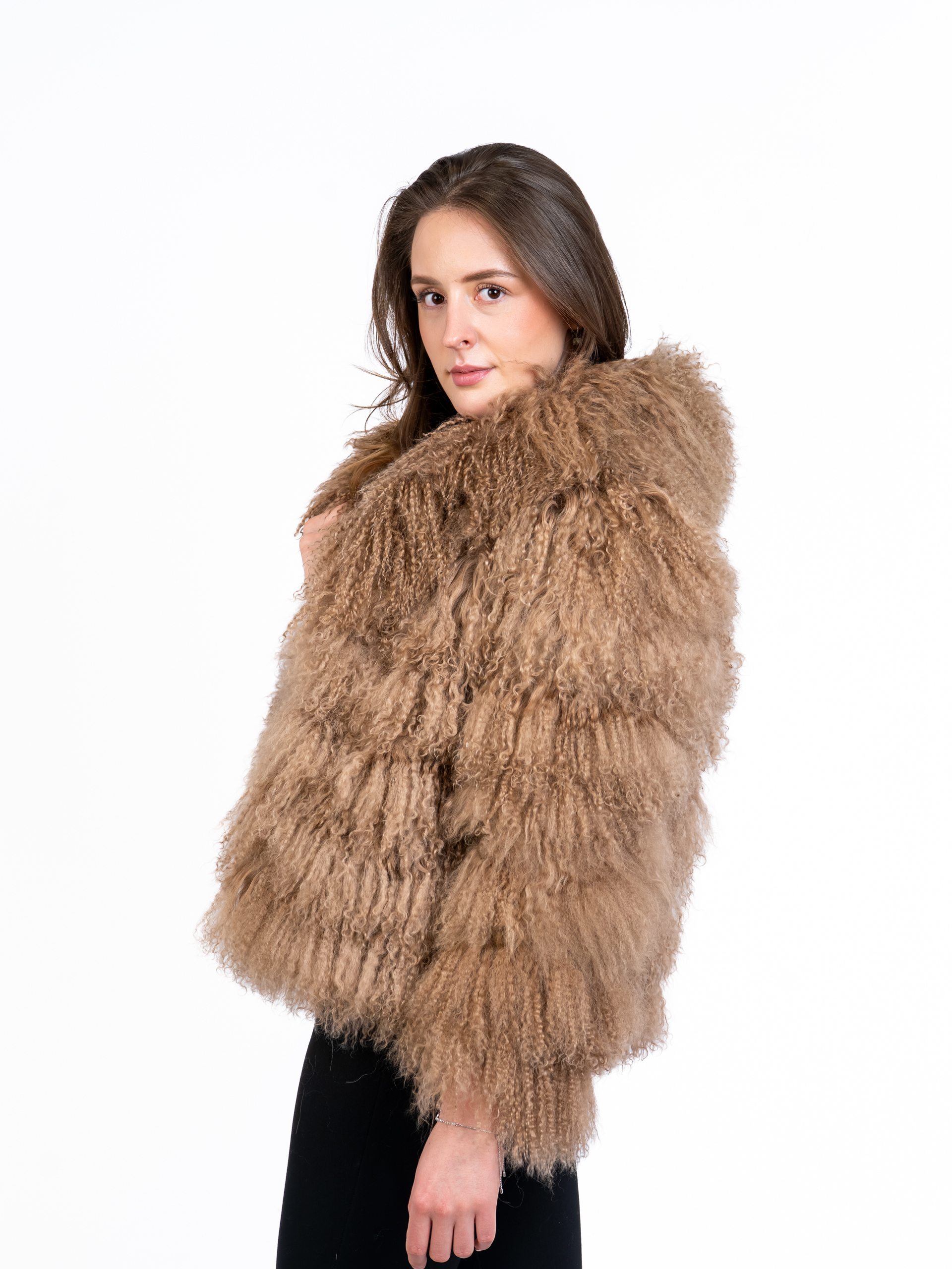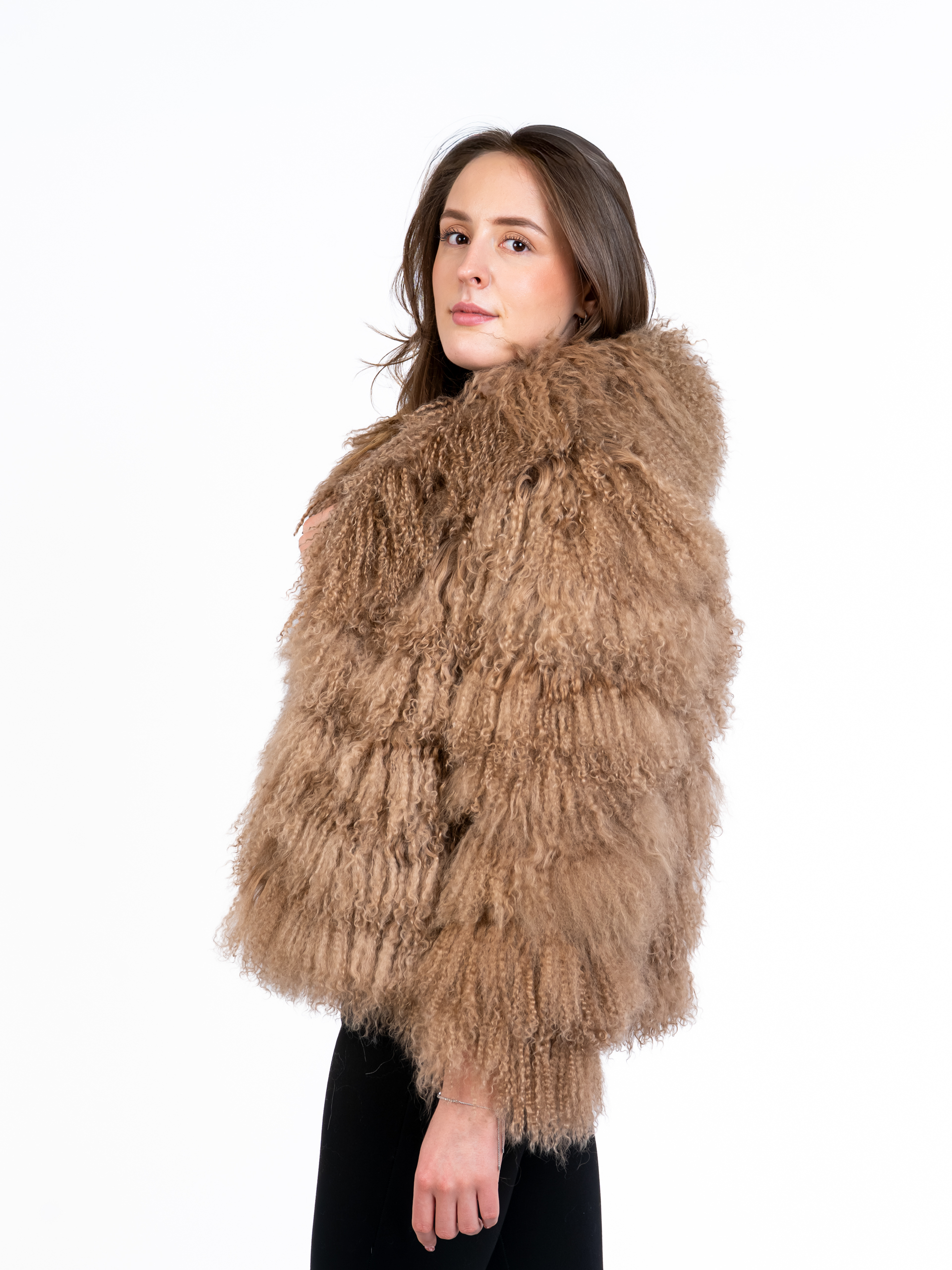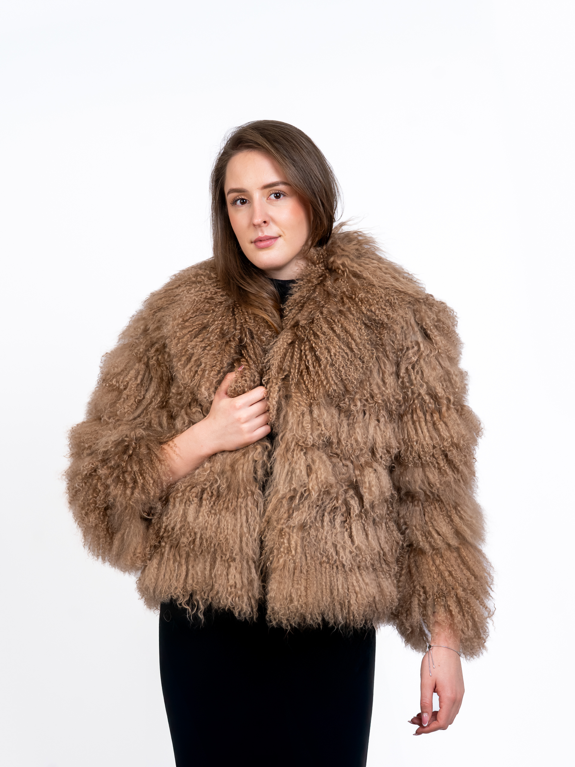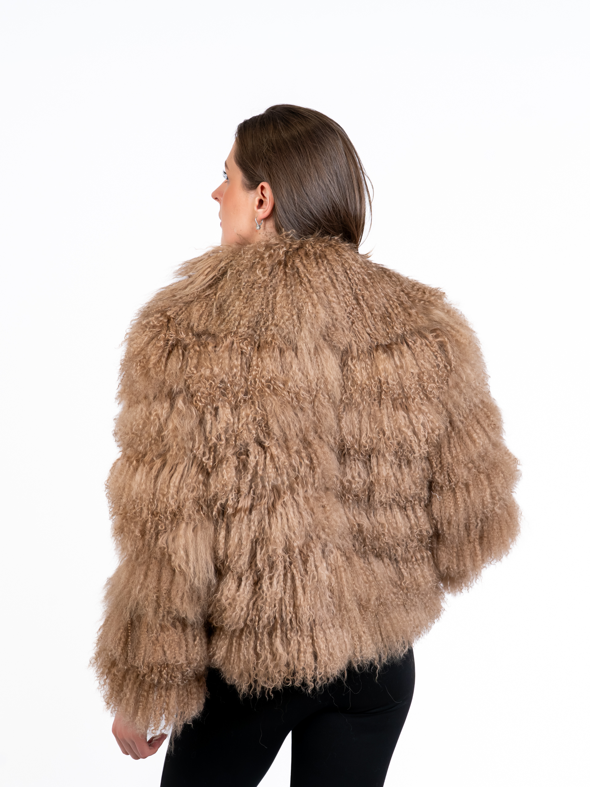 Jachetă elegantă din blană naturală de oaie mongoleză, în nuanța rafinată Mocha Mousse (maro-capuccino deschis), o piesă statement ce îmbină luxul natural cu un stil contemporan și sofisticat.