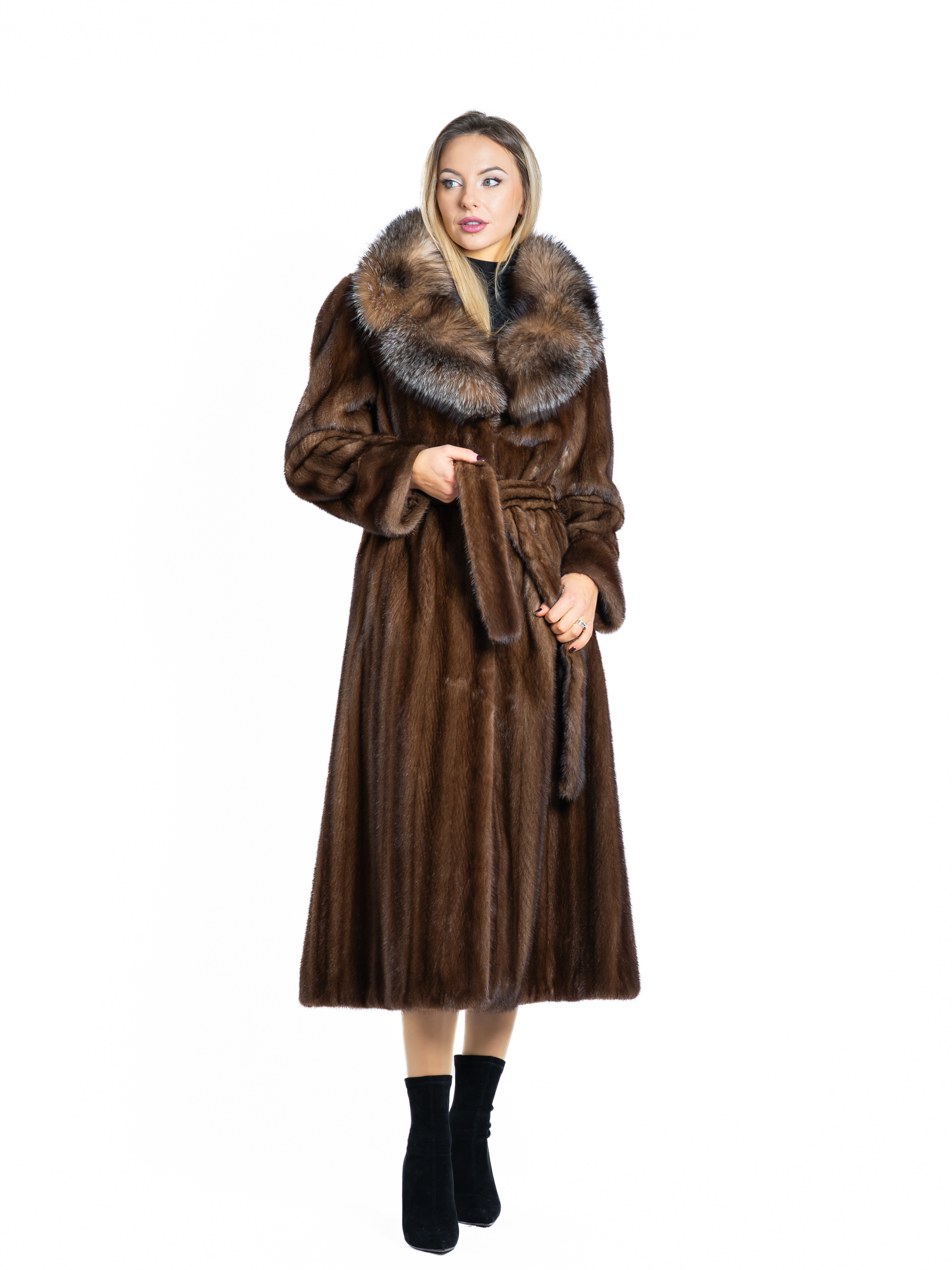 Paltonul din vizon Mahogany impresionează prin tonurile sale profunde, cu reflexii naturale, și prin detaliile atent alese.