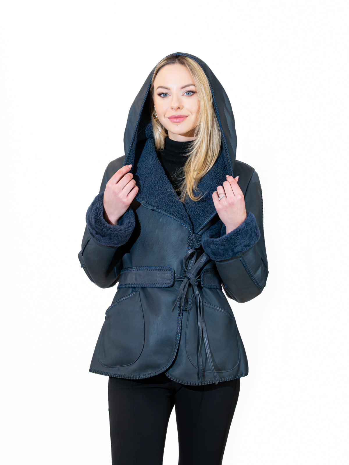 Croiala scurtă, cu talia evidențiată de un cordon din piele de cojoc, oferă un plus de structură și stil, în timp ce gluga largă din blană naturală adaugă volum și protecție în zilele reci.