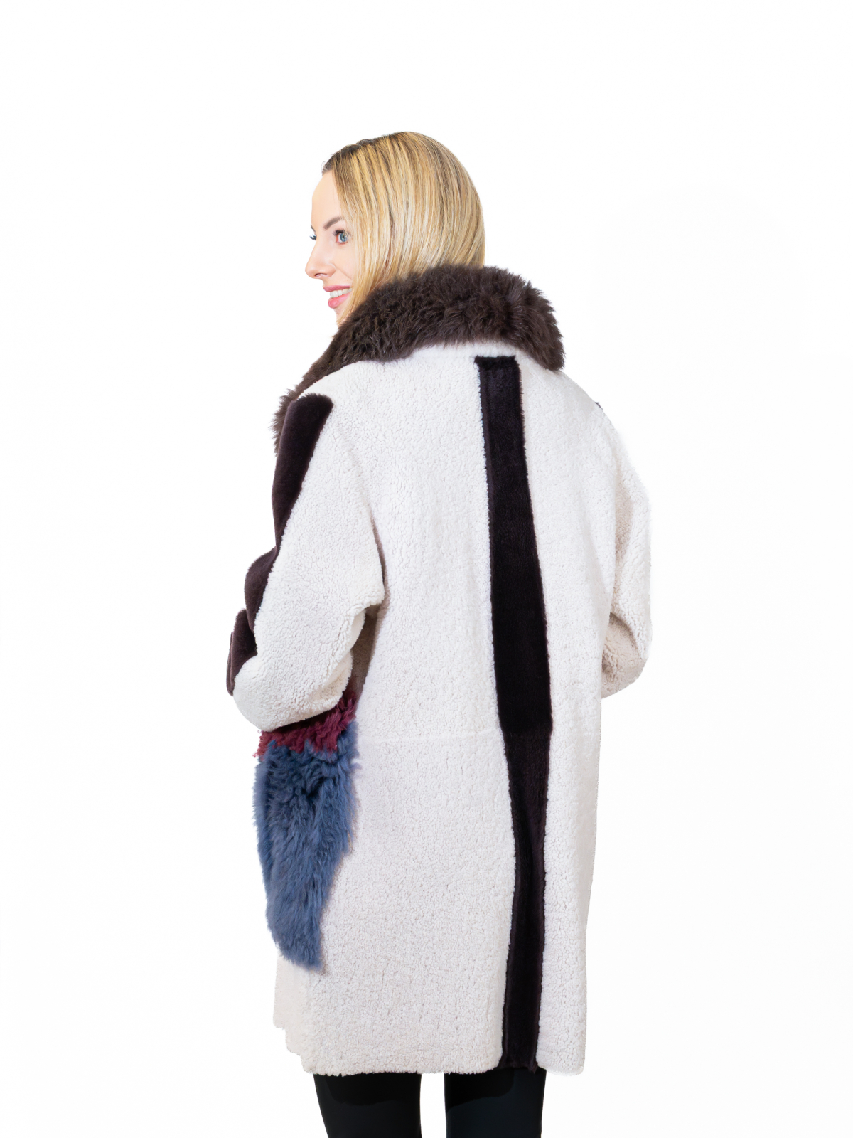 Un model statement, ideal pentru sezonul rece, acest cojoc din piele naturală de ovine este definit de o paletă de culori profundă și sofisticată: alb natural, maro, albastru închis și accente elegante de vișină putredă (burgundy) – reunite sub denumirea inspirată Nocturne Blend
