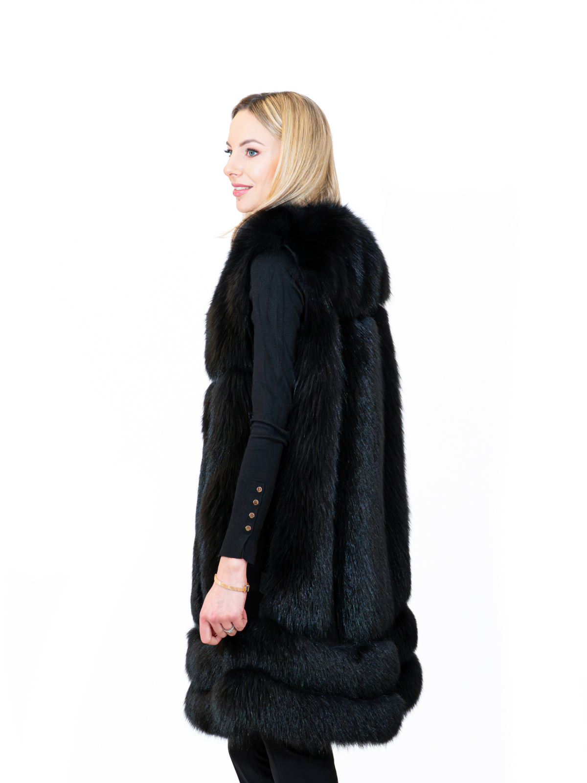 Această vestă lungă din vulpe polară, se remarcă prin textura sa bogată, volumul spectaculos specific acestui tip de blană.